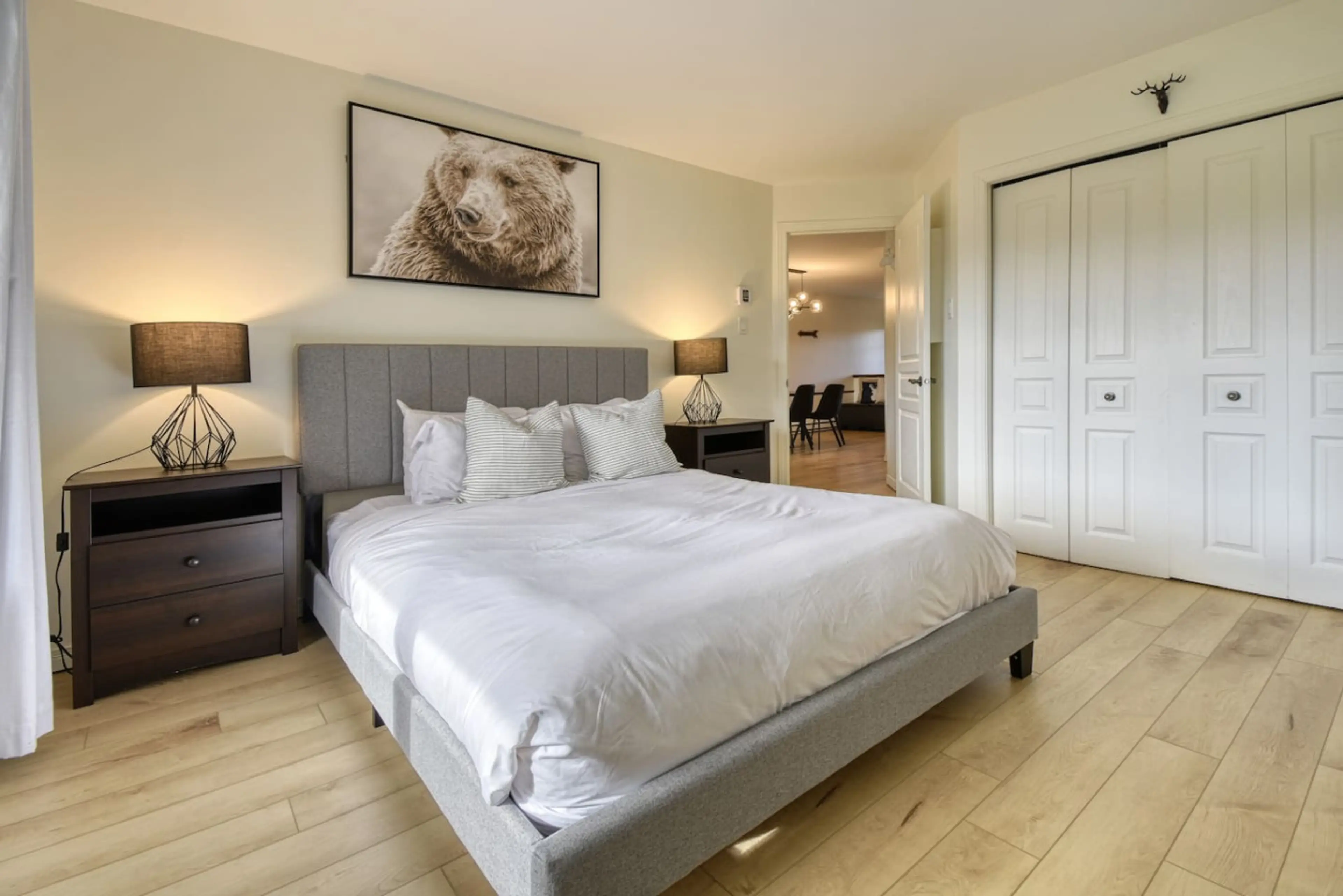 CITQ 223157: Located only 5-7 minutes from the Mountain, our modernly designed chalet is ideal for vacationers seeking an oasis near the heart of the action. Located on the beautiful Golf Course La Bête. Comfortably accommodates 4 people (1 Queen bed,1 Sofa Bed). AC, Wood-burning fireplace, TV, BBQ...