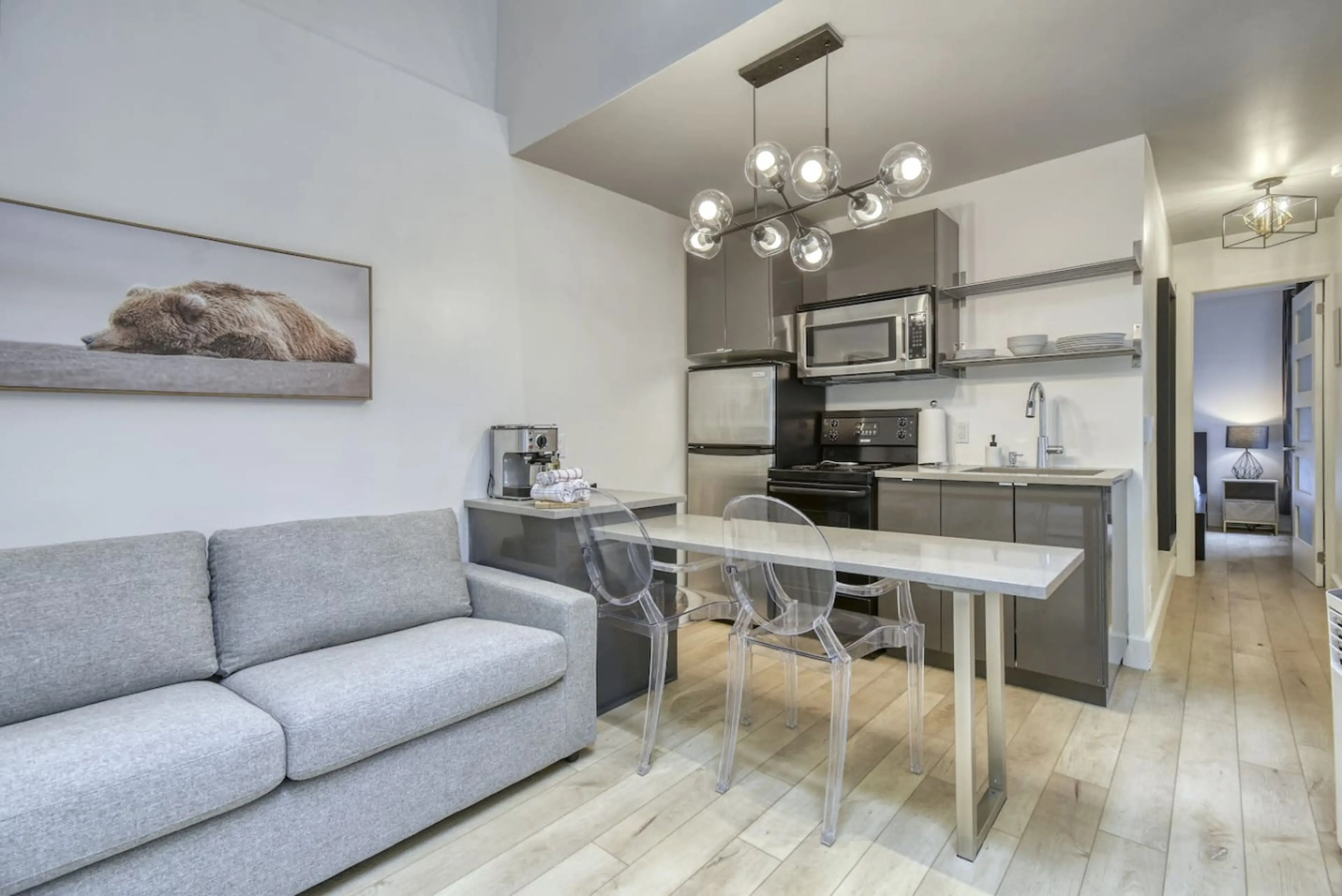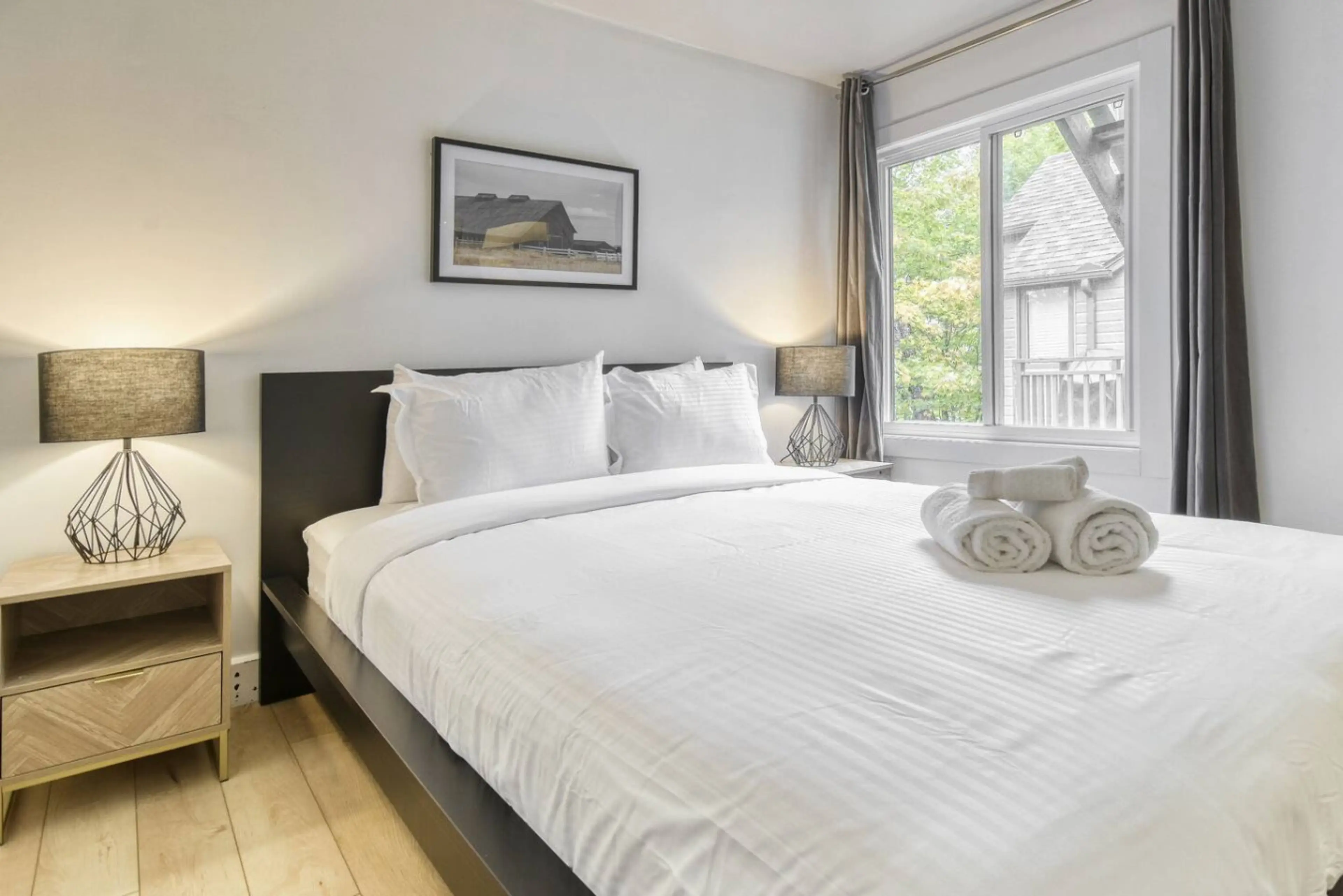 *320 Square feet* Only a 1 minute walk to the ski lifts at the Tremblant Ski Resort/Pedestrian Village in Domaine de la Montagne! Enjoy a relaxing oasis in our newly renovated+ newly furnished modern loft with minimalistic modern design! Ideal space for 2 adults + 2 children. Features a queen bedro...